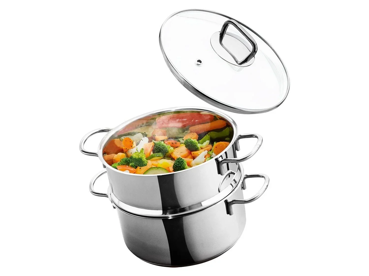 - Deze 3-delige set van RVS bestaat uit een pan, glazen deksel met stoomuitlaat en een stoominzetstuk