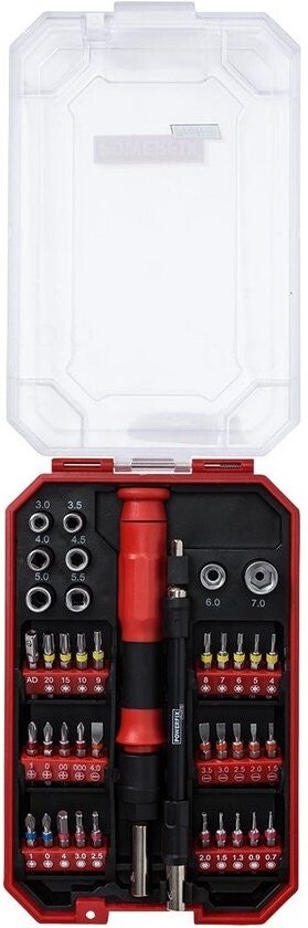 Opbergbox: ABS, PC; greep: ABS, PP; verlengstuk: staal, kunststof; bits: S2 staal (gehard, gepolijst, gegalvaniseerd)